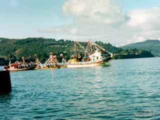 Procesión de San PedroEmbarcaciones participando de la procesión de San Pedro por la Bahía de Corral. Se observan la embarcación Alondra II, propiedad de José Rivera, y Luz Eliana, propiedad de Manuel Vidal, entre otras.