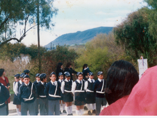 Desfile del 18 de septiembre de la escuela Enrique Hevia Labbé de Riñihue. Fue uno de los primeros desfiles. Aparece la profesora Haydee Rivera junto a sus estudiantes de la escuela multigrado y Leonel Huenchuñir.
