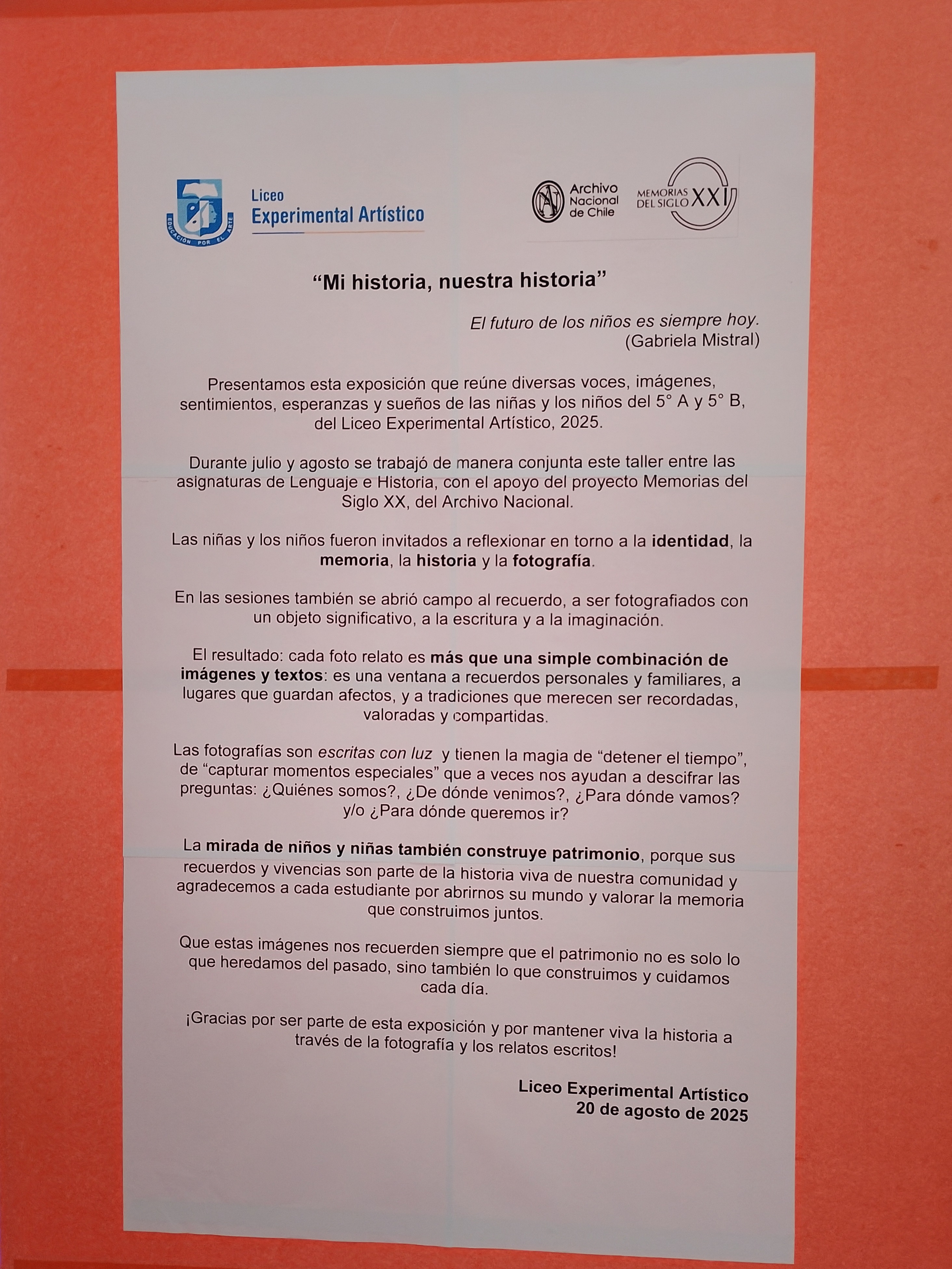 Por su parte, Nicolás Holloway, agradeció y felicitó el trabajo realizado por la comunidad educativa del LEA, destacando la importancia de las fotografías, los testimonios, la escritura, la memoria y el patrimonio en los procesos educativos. Finalmente, se obsequió a cada estudiante su fotografía/retrato y se compartió el pasaporte del Día del Patrimonio de Niñas, Niños y Adolescentes - 2025, motivándoles a participar de dicha actividad.