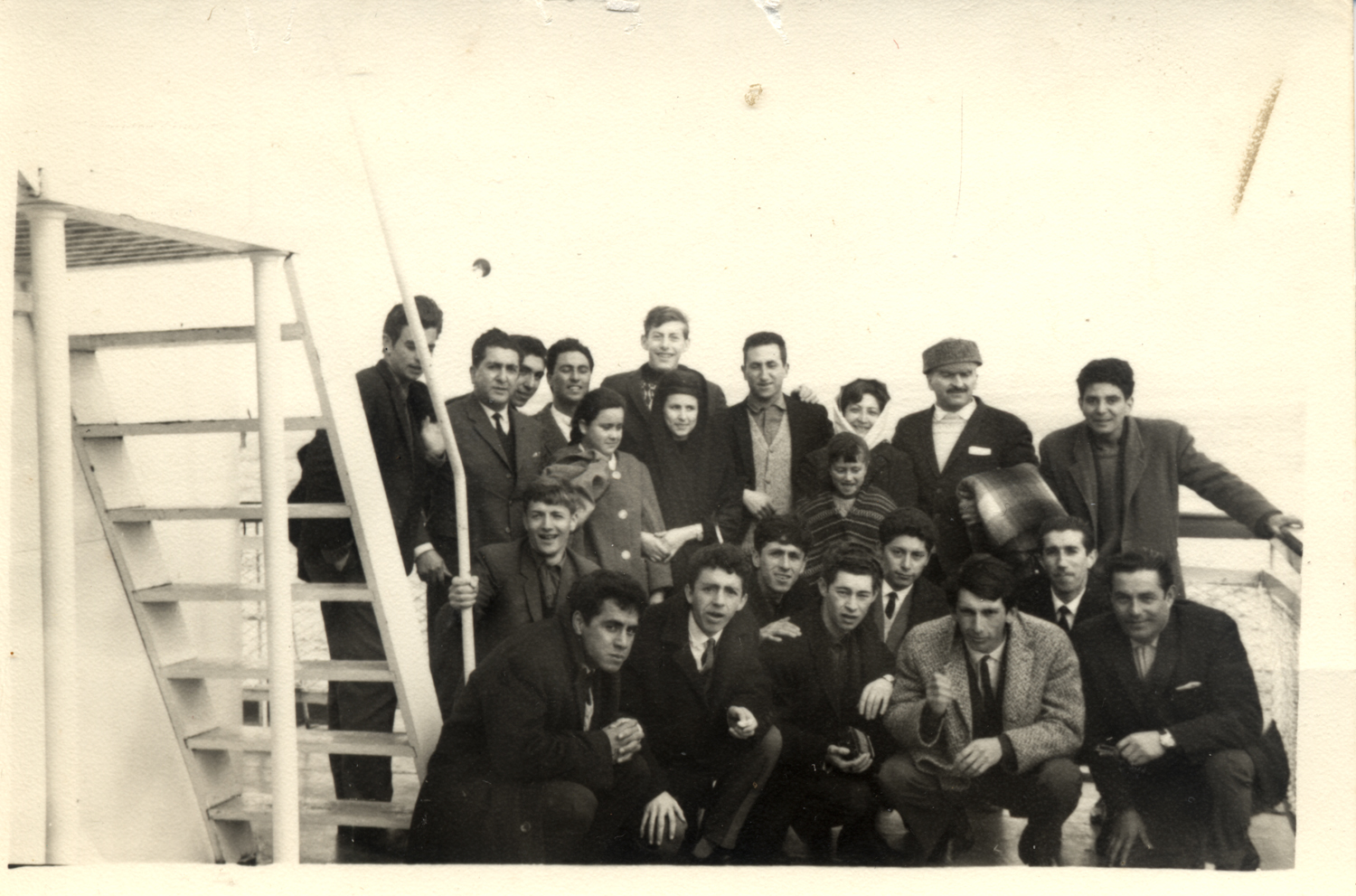Selección de básquetbol del liceo Río Bueno pasando el canal de Chacao en el ferry con rumbo al campeonato en Ancud. Aparecen Arturo Reyne, Nelson Hoffman, José Vásquez, Aurelio Jaeger y Jaime Águila.