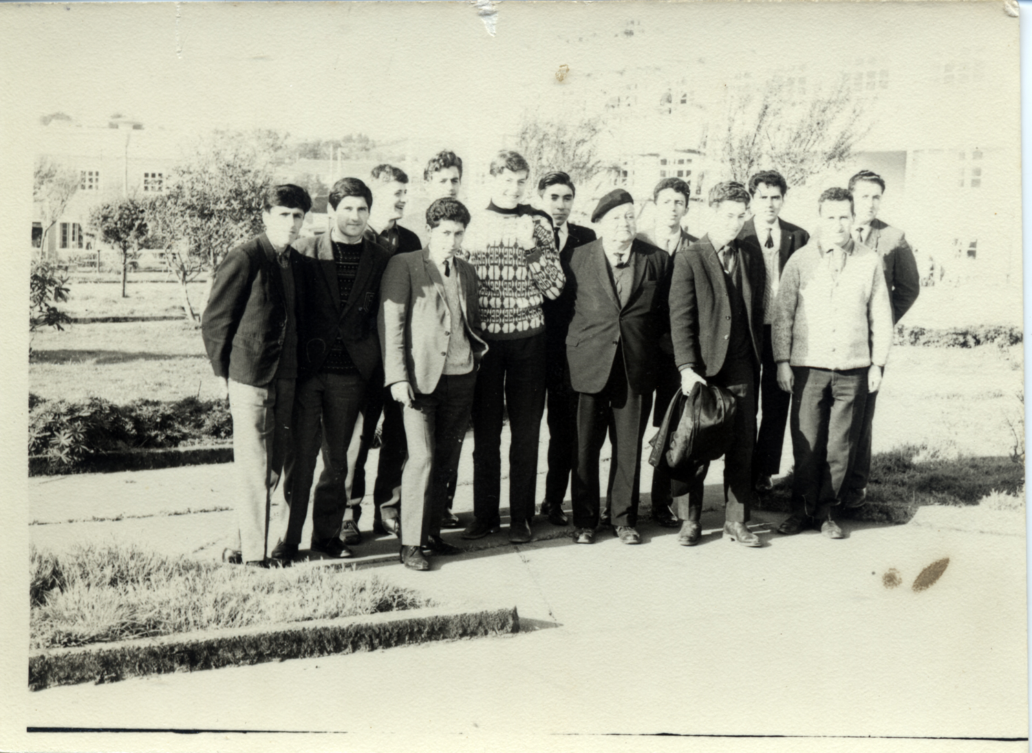 Licenciatura de Enseñanza Media, 6° año de Humanidades, de Adolfo Sommer junto a su profesor jefe, Pedro Pierotich, en el gimnasio del Liceo de Río Bueno.