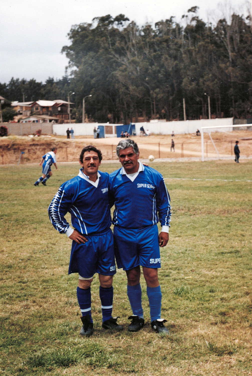 Enrique Muñoz, de cabello canoso, junto a Ricardo Pérez, dos grandes jugadores del Club Deportivo El Tabo, en el estadio de El Tabo.
