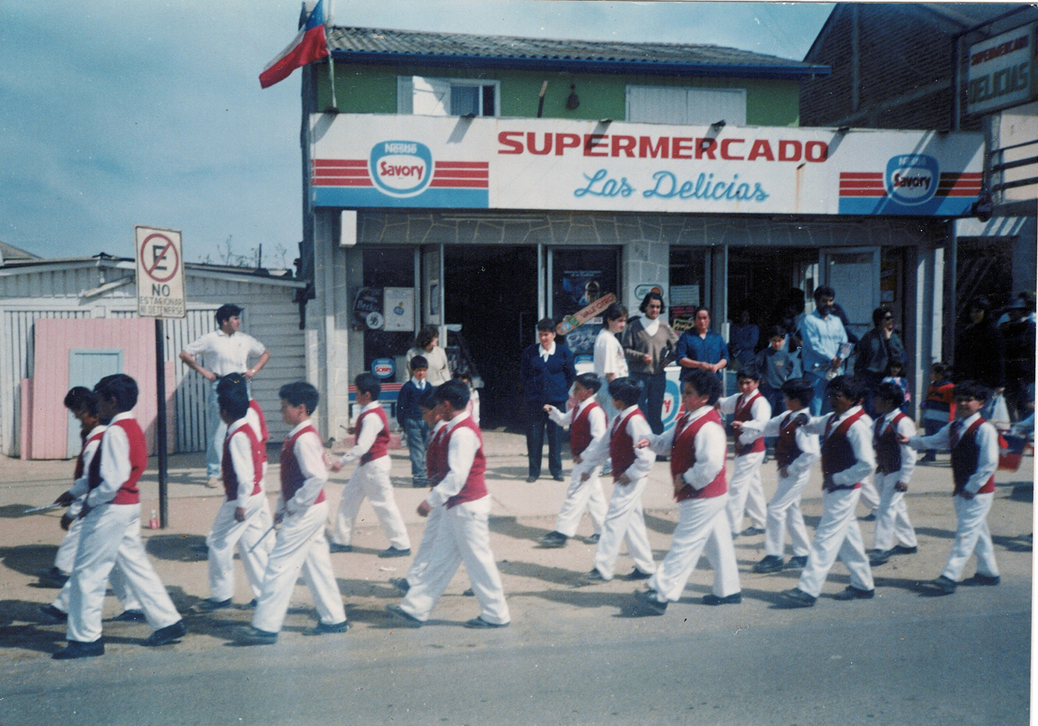 Banda de guerra instrumental del Colegio El Tabo desfilando por la calle San Marcos. En la imagen aparece Roxana Berrios, vestida con camiseta azul, junto a Nora, dueña del supermercado “Las Delicias”.