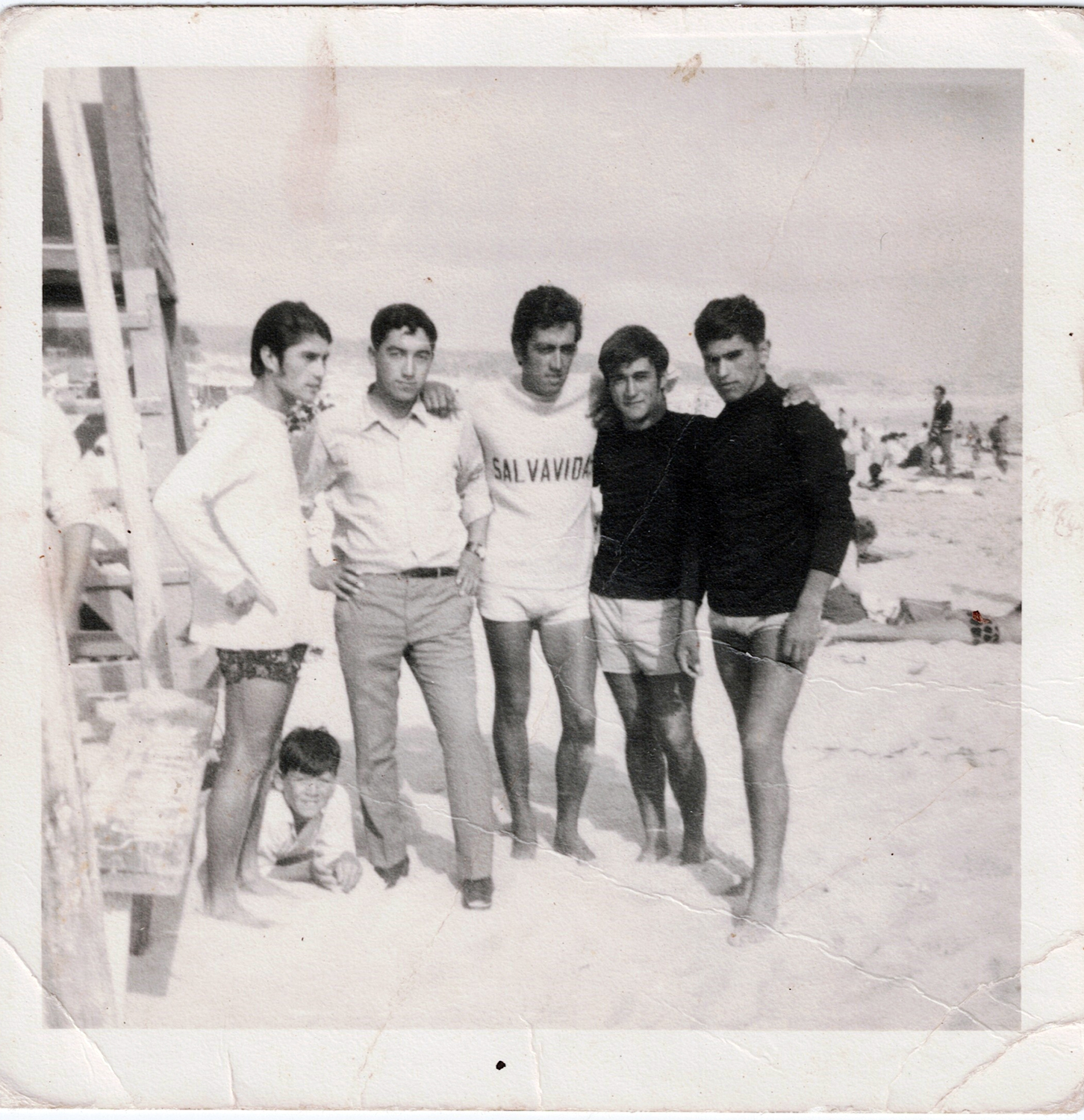 Fotografía tomada en la playa Chépica “A”. Aparecen Bernardo Seguel, carabinero del retén El Tabo, y Dámaso Santis, con un polerón blanco que lleva la palabra “salvavidas”, uno de los mejores rescatistas del litoral central.