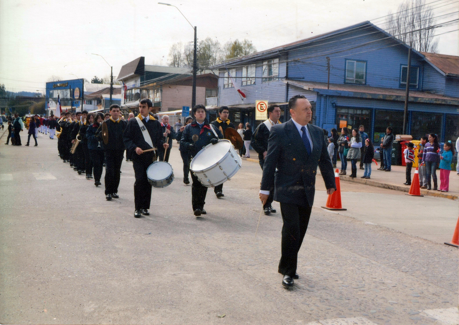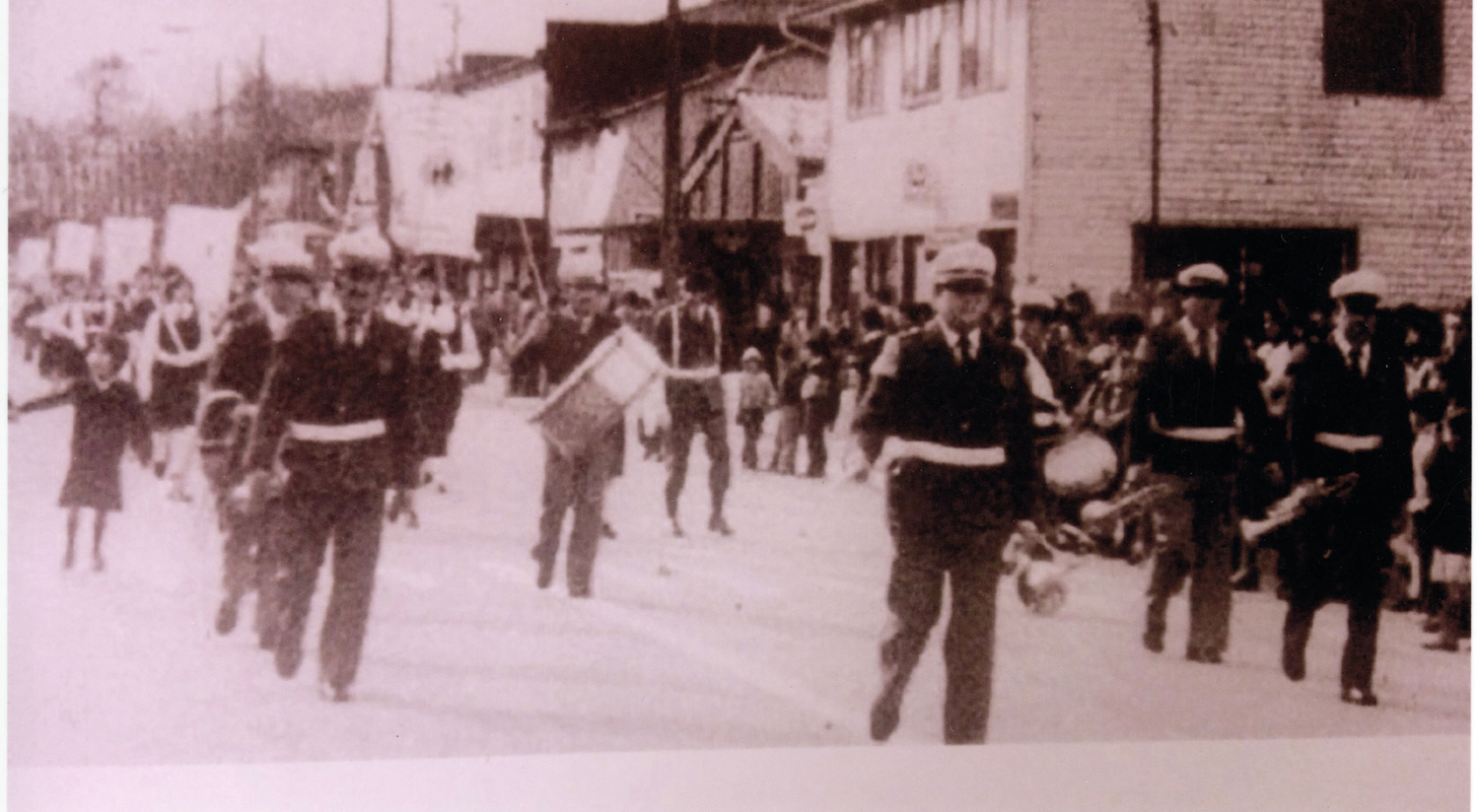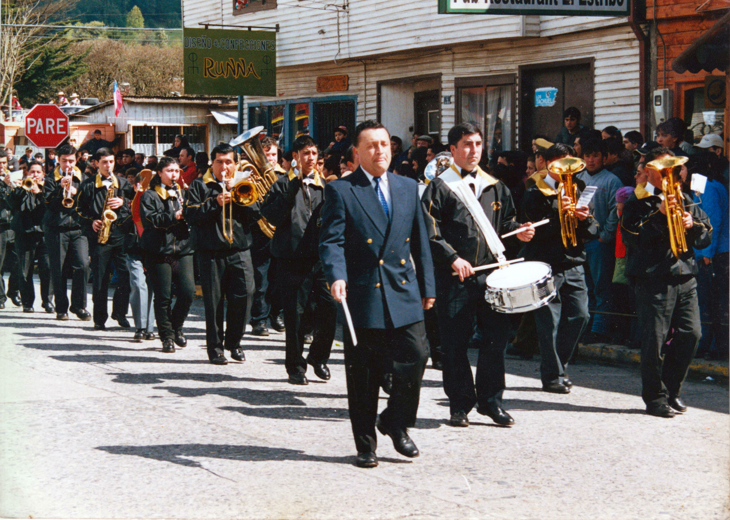 De vuelta de un desfile de fiestas patrias, con un refuerzo de la banda Eleuterio Ramírez de Valdivia. Atrás se ve la farmacia Torres y la carnicería.