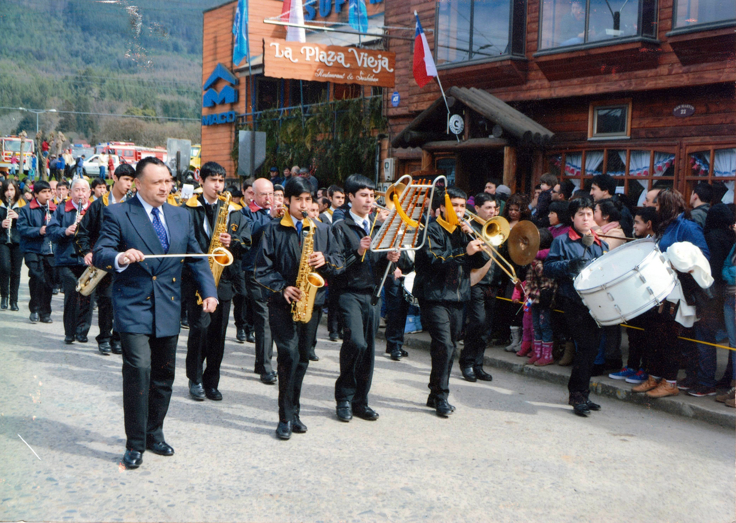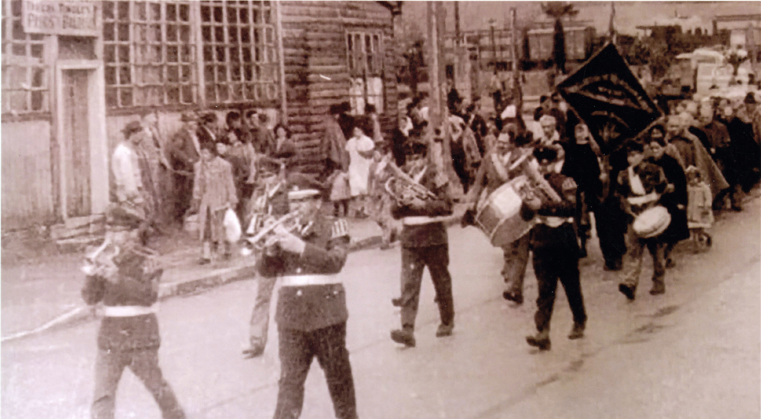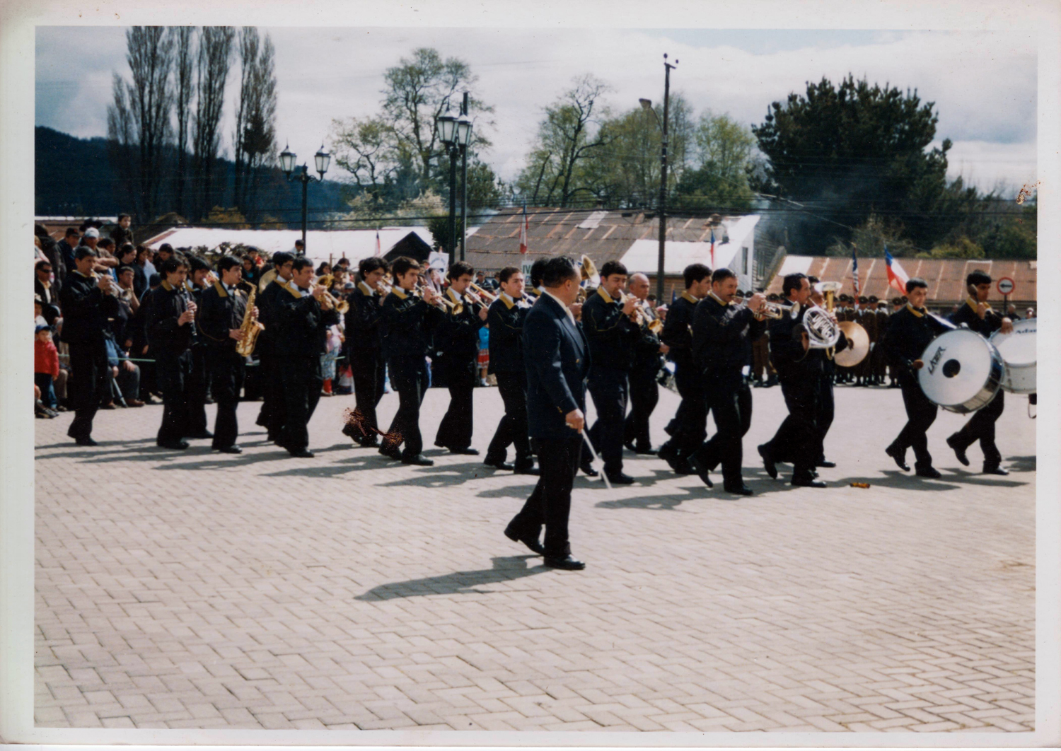 De vuelta de un desfile de fiestas patrias, con un refuerzo de la banda Eleuterio Ramírez de Valdivia. Atrás se ve la farmacia Torres y la carnicería.