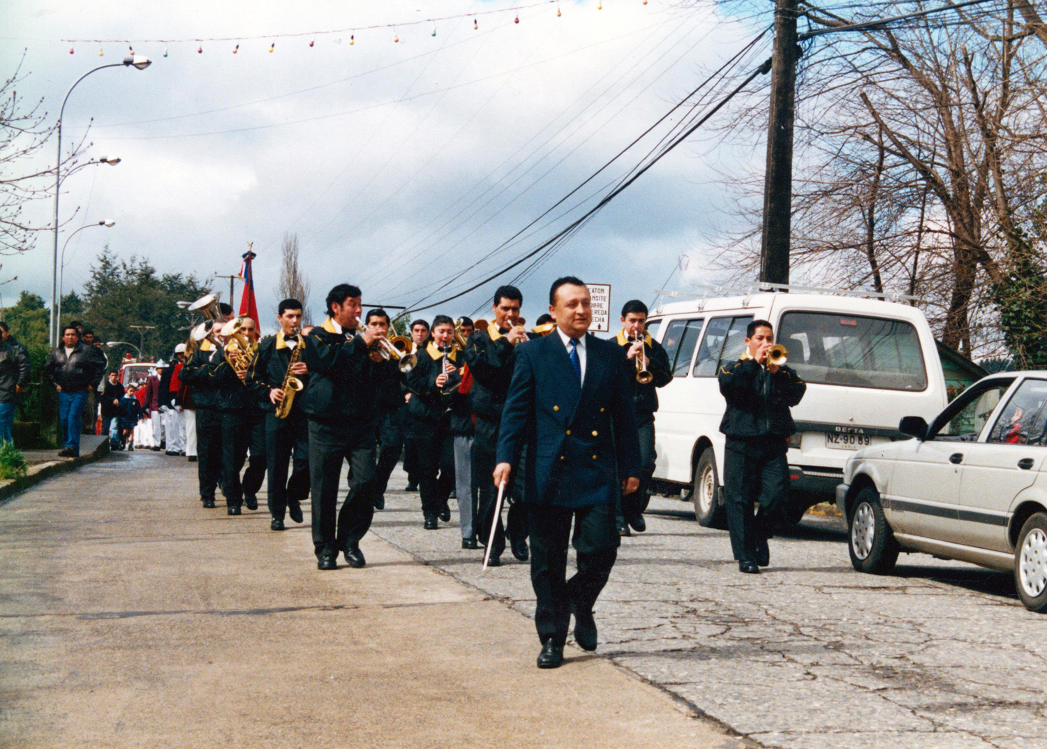 Samuel Ocares liderando la Banda Esmeralda en dirección a la plaza. Aparecen: Roberto Yáñez, trompeta; Juan Carlos Gil, saxofón; Hernán Jaramillo, barítono; y Francisco Guajardo, trompeta.