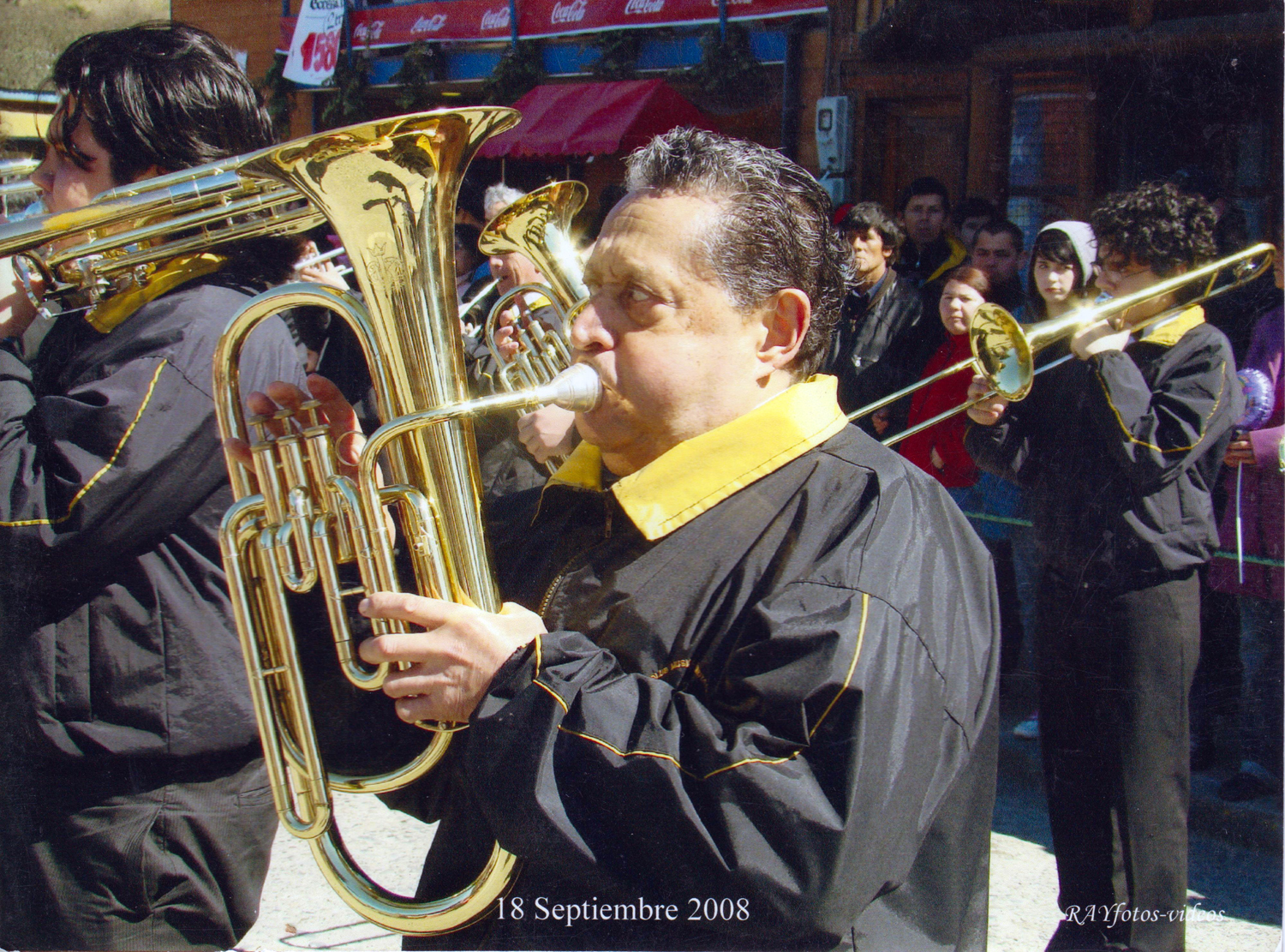 Emilio Ocares tocando el barítono en la plaza Nueva, llegando al desfile. El donante comenta: “Emilio Ocares siempre ha tocado instrumentos “roncos”, uno de los instrumentos que lleva el “contracanto” en una banda instrumental.