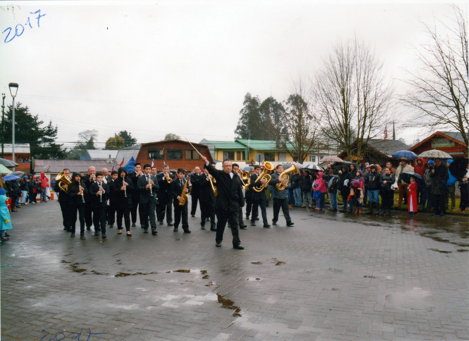 La banda Esmeralda reforzada por la banda Eleuterio Ramírez de Collico, encajonando el desfile en calle Lynch. Atrás la ex estación de ferrocarriles.