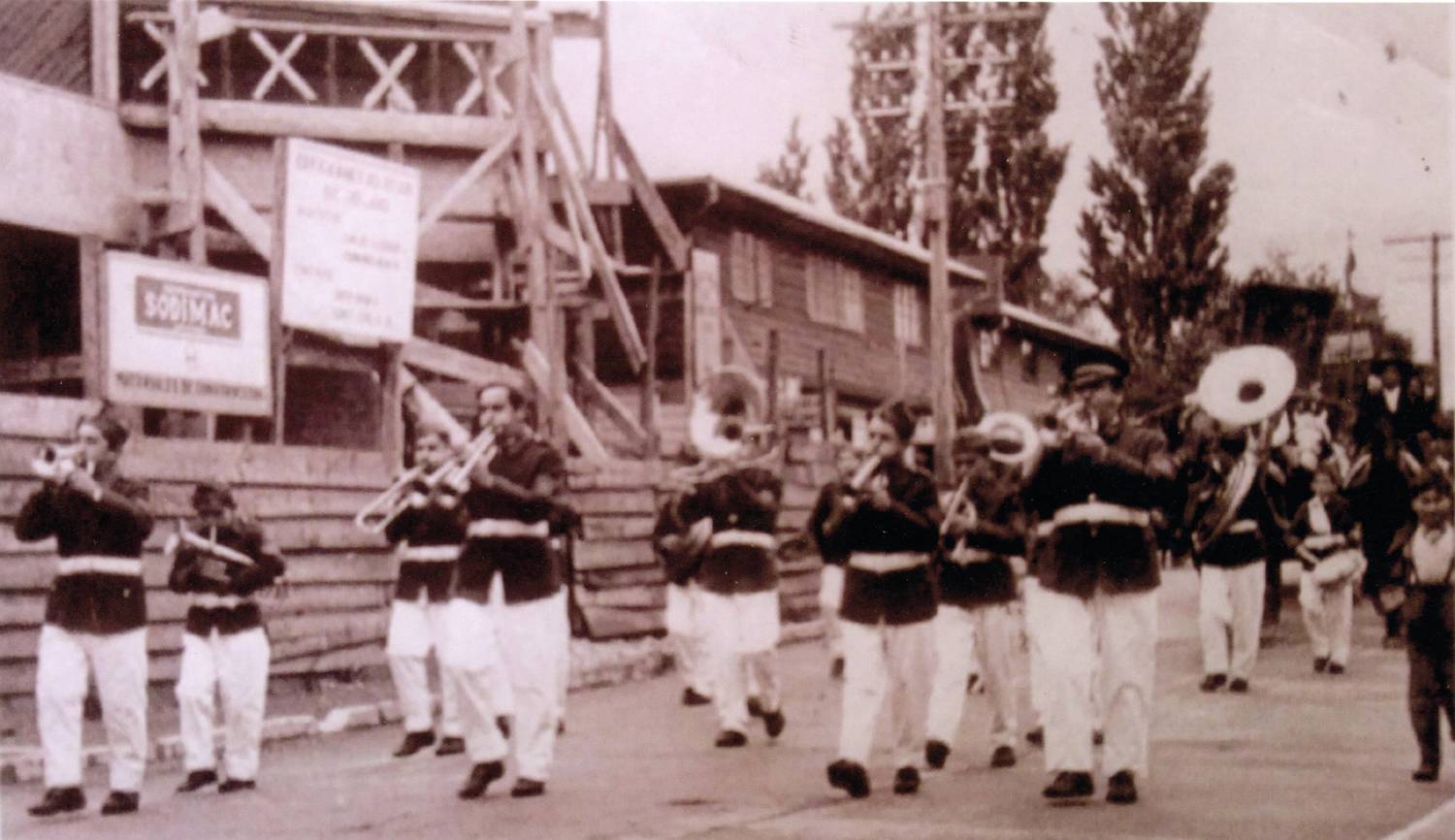 Guido Álvarez, Jaime Zambrano, Heraldo Henríquez, Gabriel Hernández, Jaime Moulet, Enrique Miranda, Beltrán en la tuba, Emilio Ocares en el tambor y un niño apodado “Cachito” en los platillos, hijo de Cindy, dueña del hotel France. Al fondo se observa la municipalidad, institución que aportó el uniforme utilizado por aproximadamente 12 años.