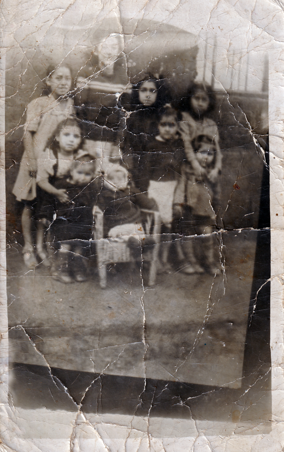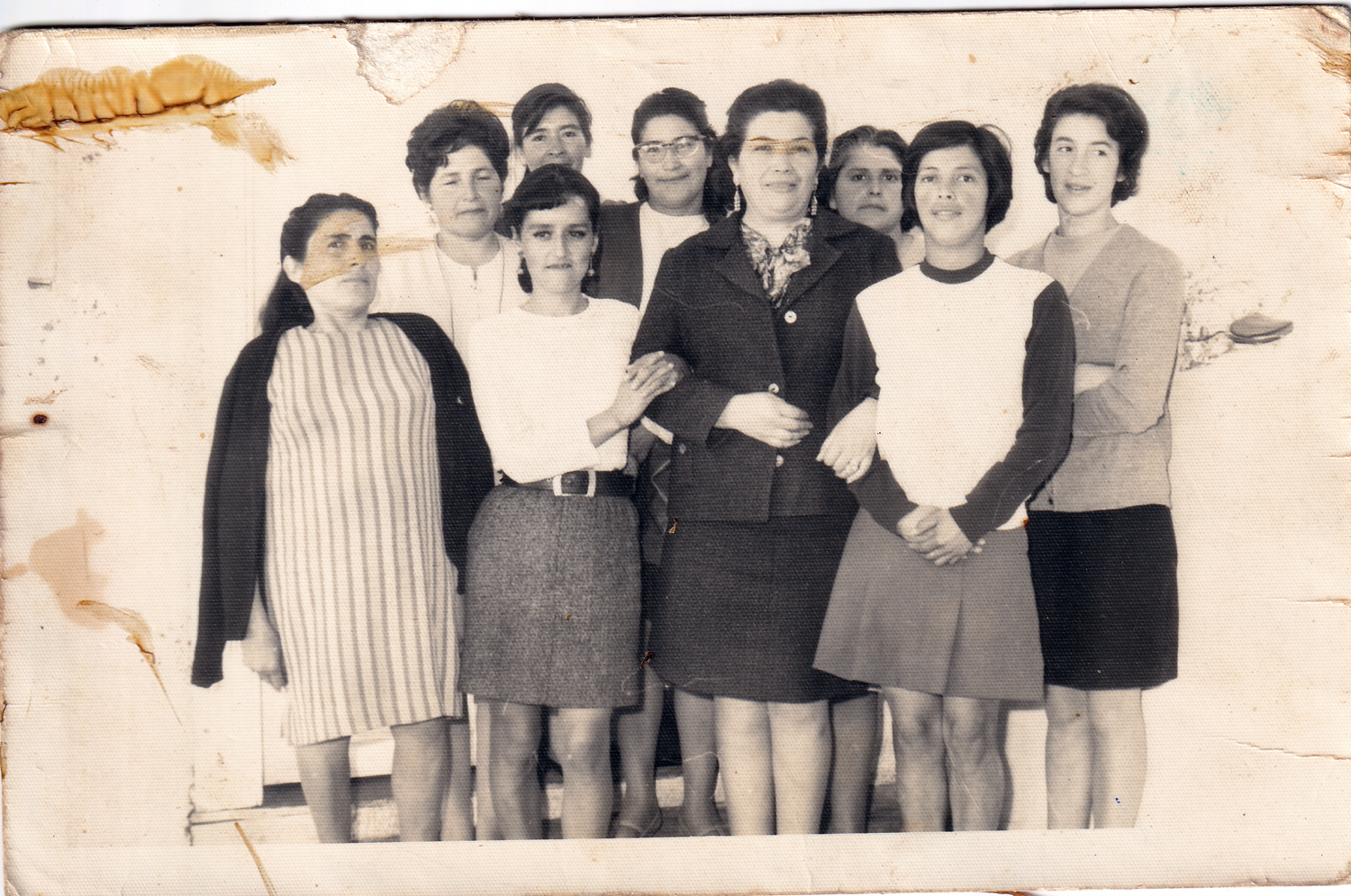 FamiliaLeonor Poblete junto a su hermana y los hijos, hijas y sobrinas de Ernesto Saldivia. La donante comenta: “Aquí estamos en la casa de don Ernesto Saldivia. Él nos dio alojamiento por un tiempo, ya que en la casa donde vivíamos, en calle Campo Amor, se nos llovía. Ese año hubo un temporal. La vivienda estaba ubicada en Zamaniego con Alonso Cano”.