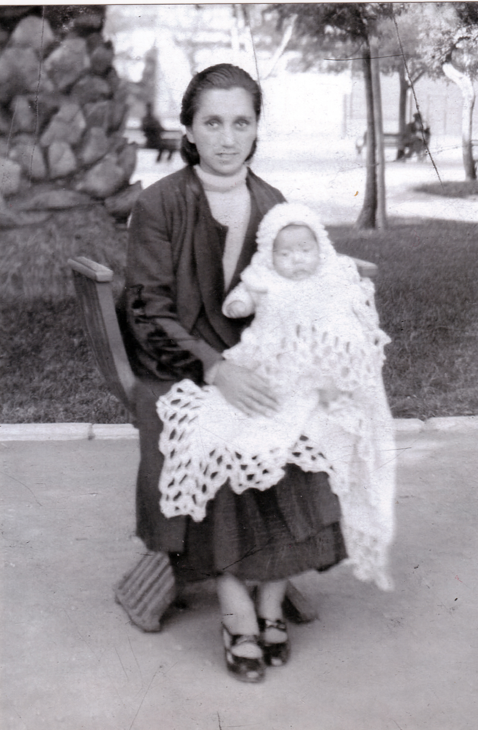 Recuerdo de mi madre y hermanoIsmenia Poblete, madre de Leonor Poblete, con su hijo en brazos en la plaza O’Higgins. La donante comenta: “Mi hermano falleció antes de cumplir un año de edad de meningitis.”