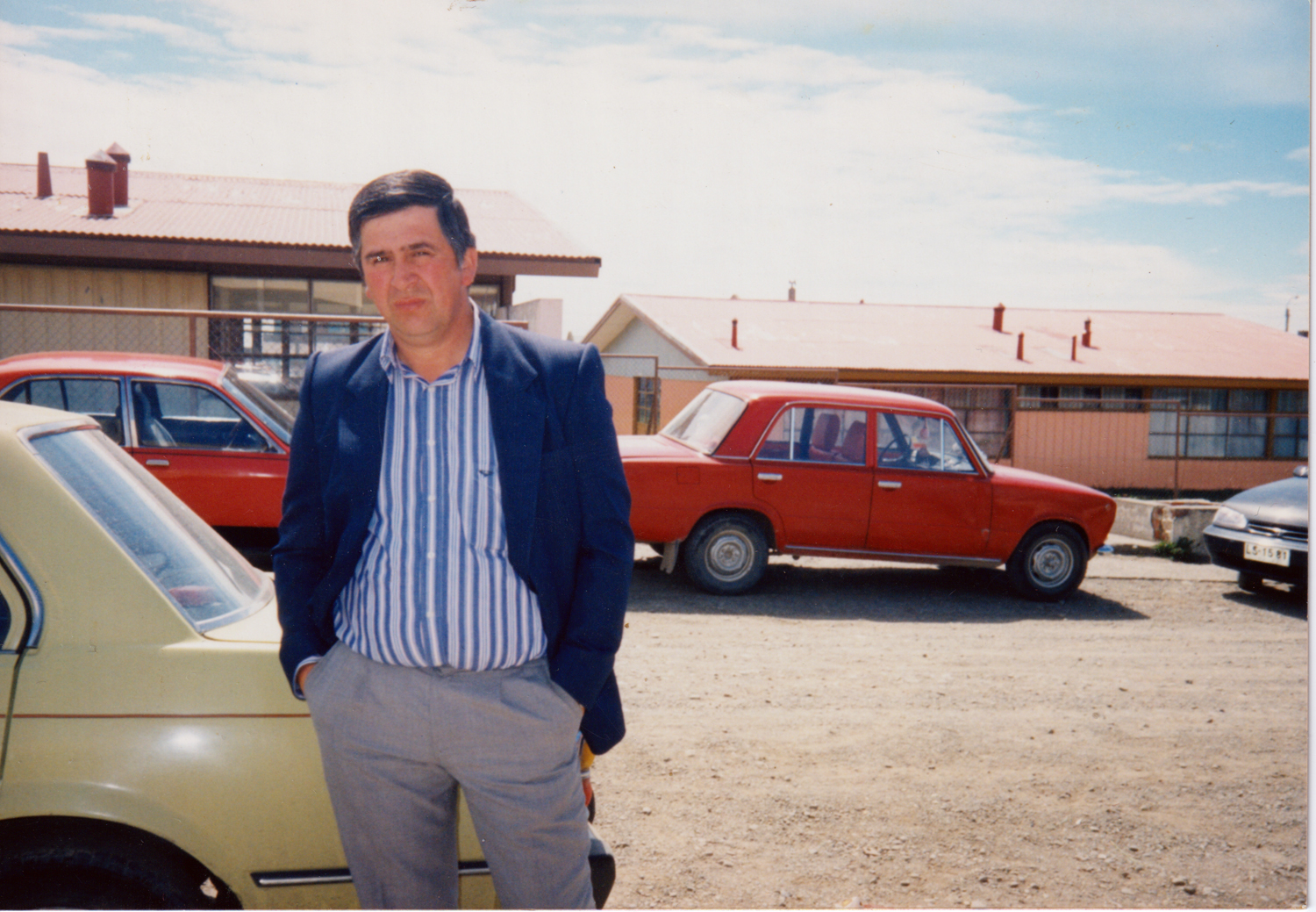 Don Pedro Gallardo junto a su camión Fotografía tomada por el mochilero Marco Britos a Pedro Gallardo en la frontera de Chile Argentina por el paso Monte Aymond, cercano a Río Gallego. En este viaje Pedro transportaba cemento desde Comodoro Rivadavia, hacia Punta Arenas.