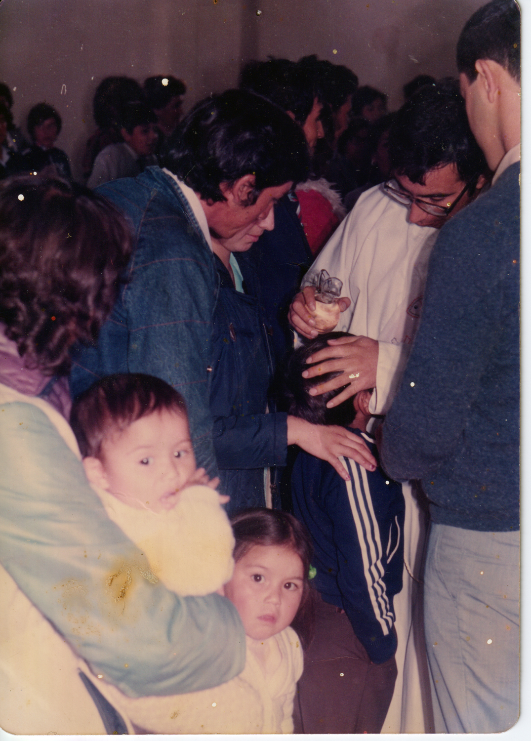 BautizoEl padre bautizando a Jaime Almonacid en la iglesia San Gaspar de Crucero. Aparecen los padrinos, Marcia Bañares y Rodrigo Almonacid. El bebé con los dedos en la boca es Cristian Almonacid.