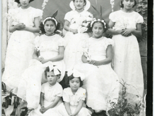 Irma Aguirre Cortés, Albertina Saavedra, Olga Yáñez, Delia Cortés, Olga Aguirre Cortés y Nora Jorquera, reina y damas de honor de la fiesta de la primavera en la Escuela N° 2 de Andacollo.