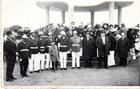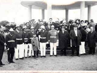 Fotografía tomada en la glorieta de la plaza de armas de la comuna de Máfil, con motivo del aniversario del Cuerpo de Bomberos. Entre los voluntarios se encuentra Leopoldo García Morrison.