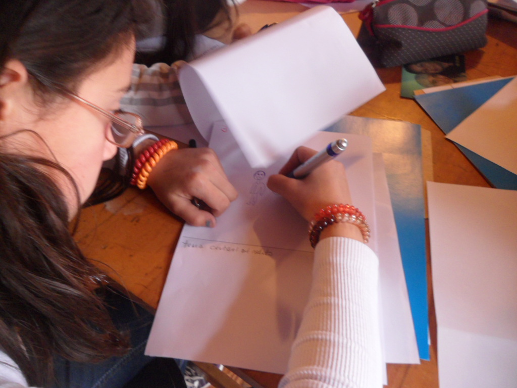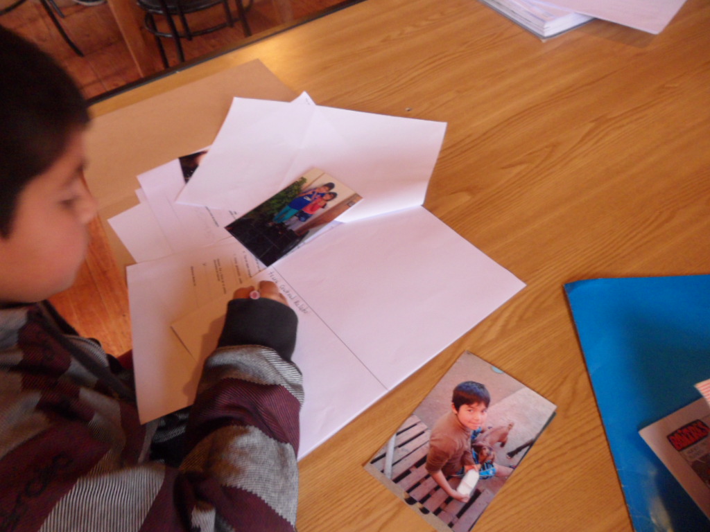 - Taller: En esta sesión, las y los estudiantes se organizaron en grupos. El objetivo del trabajo fue titular sus fotografías y comenzar a elaborar los dibujos que acompañarán al texto del kamishibai. 14 de agosto de 2014.