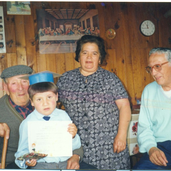 Ceremonia de confirmación en CochamóVíctor Gutiérrez junto a su padrino, Víctor Orlando Soto. Los acompañan Sebastián Contreras y Sergio Morales, frente a la parroquia Inmaculada Concepción.
