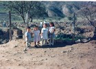 Edgardo Rojas, Bárbara Michea, Diana Piñones y Daniela Cox. En el fondo, se ve a los vecinos jugando rayuela. Esta costumbre dominguera se perdió con el traslado del pueblo. El éxodo de los habitantes de Gualliguaica se produjo debido a la construcción del embalse Puclaro que inundó el antiguo pueblo.