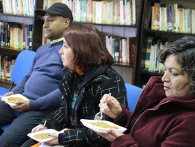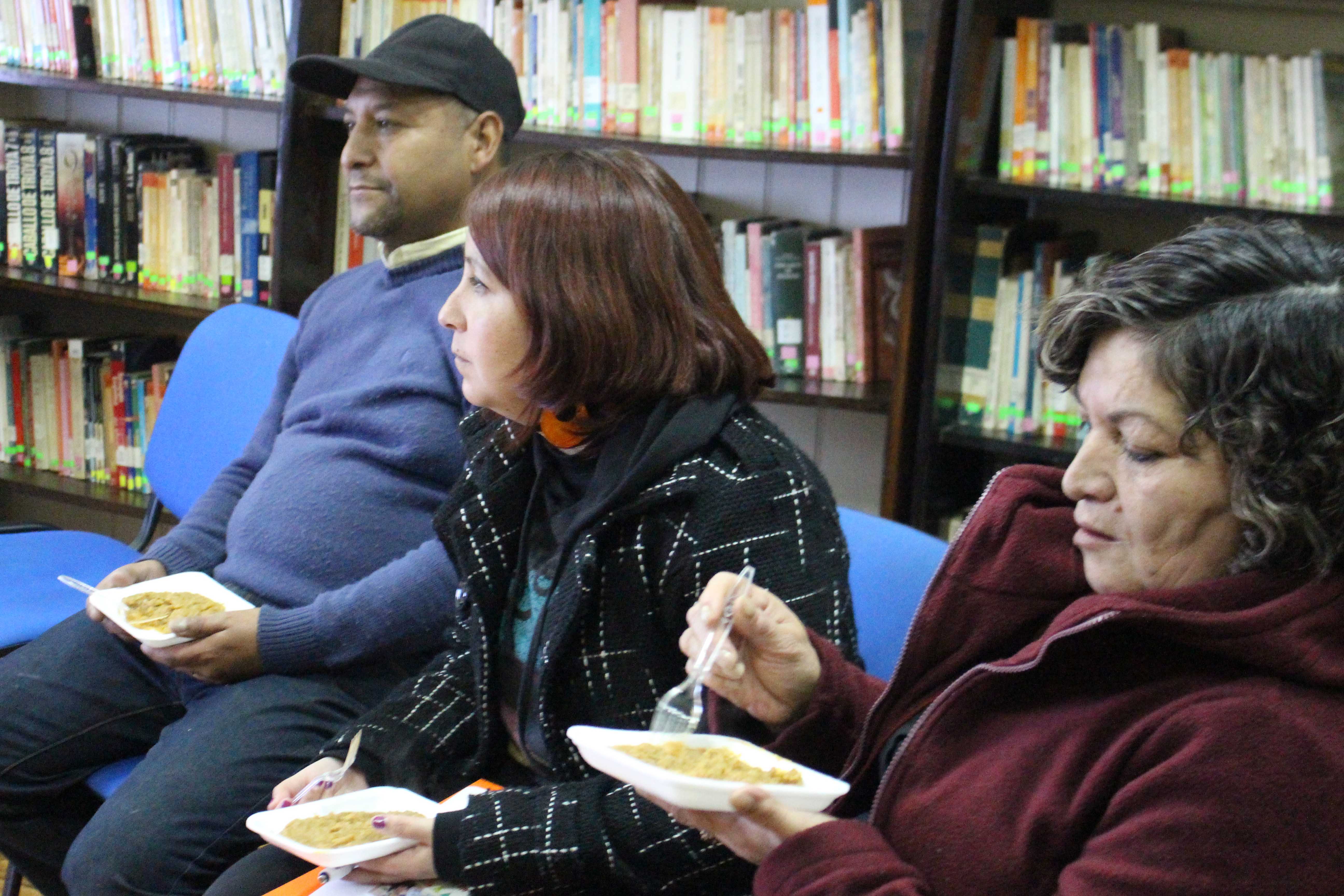 Durante la actividad se compartieron churrascas y cochosango, una preparación de la zona compuesta de harina tostada, cebolla y ajo, preparada por el equipo de la biblioteca pública.