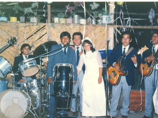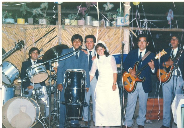 Fiesta de matrimonio donde se presentó la banda musical "Los Rayos". De izquierda a derecha: Carlos Sepúlveda, baterista; Darwin Segura, novio; Patricio Zepeda, vocalista; María Araya Bugueño, novia; Horacio Toledo y Vladimir Segura, guitarristas.