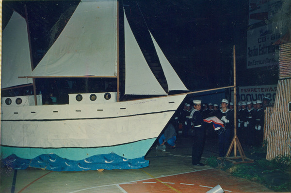 Alumnos de la Escuela Pudeto realizan una representación del viaje de la goleta Ancud a Magallanes. Actividad realizada con motivo del aniversario del establecimiento celebrado en el gimnasio fiscal.