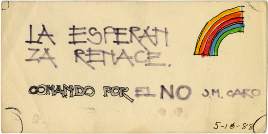 Tarjeta hecha a mano por los vecinos de la población José María Caro que participaban del comando por el NO en el plebiscito de 1988.