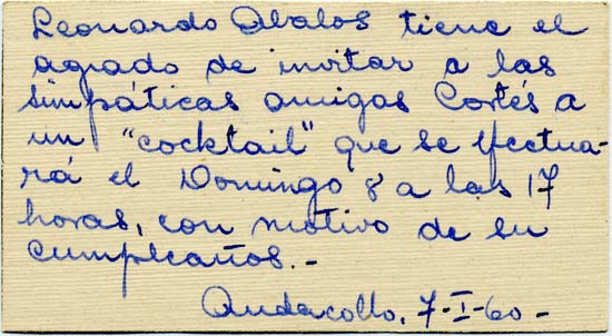 Muchas de estas invitaciones están escritas a máquina o elaboradas en imprentas. Sin embargo, también encontramos una tarjeta confeccionada a mano por Angélica Macaya, con motivo del bautizo de su ahijado, Julio Arenas López.