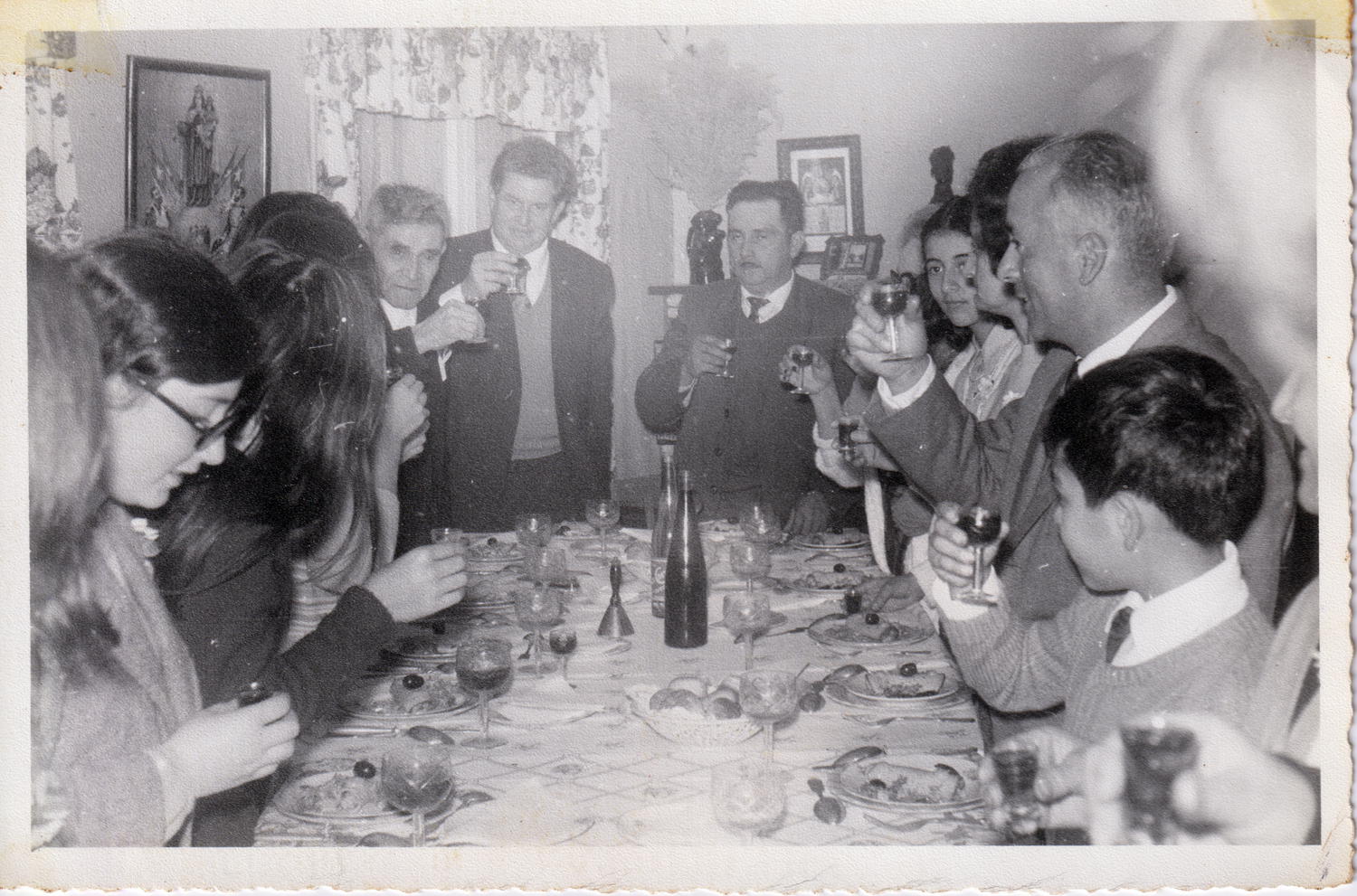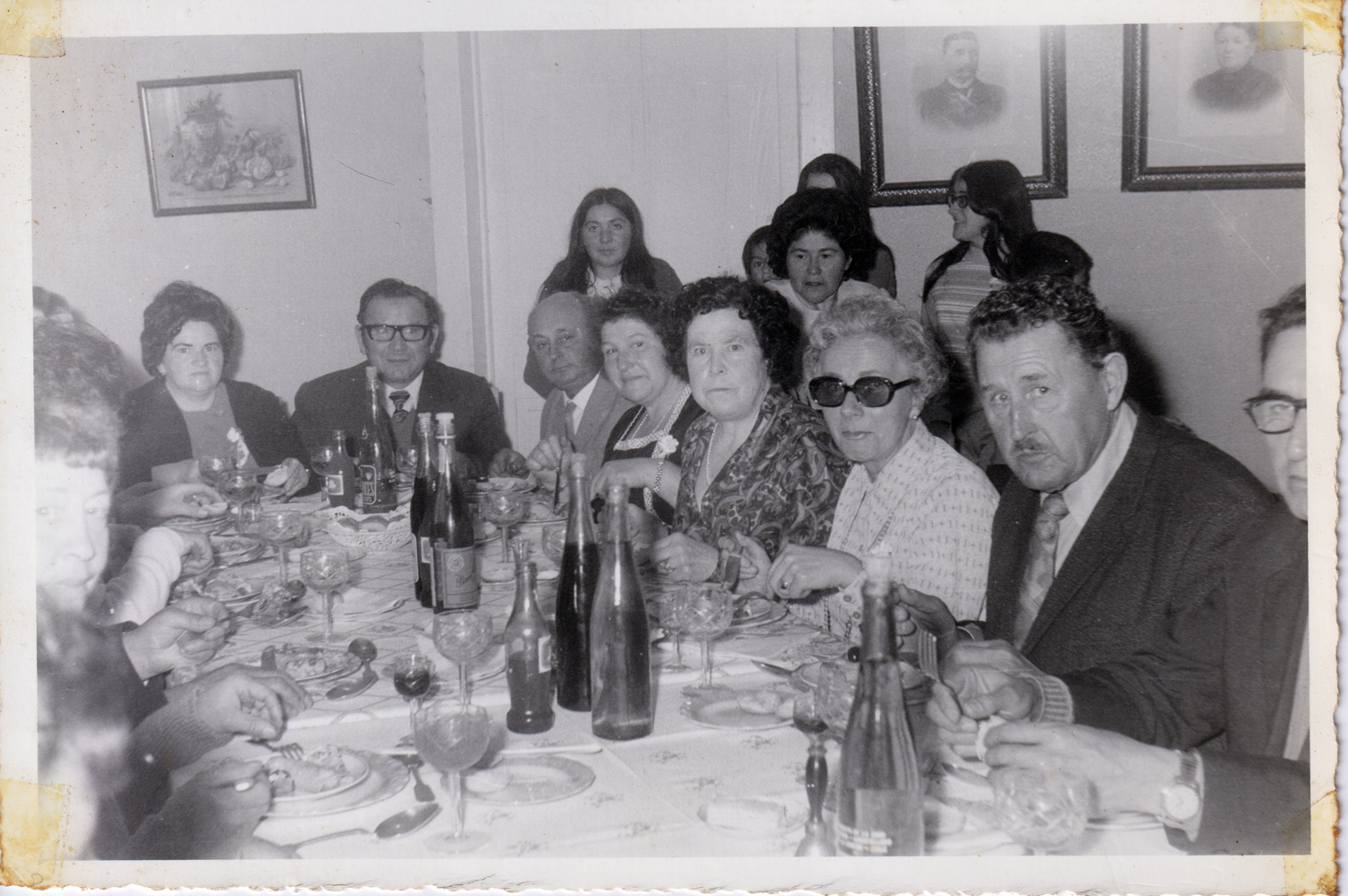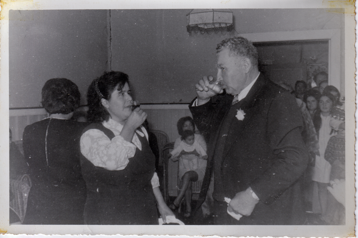 Invitados a la boda de Elsa Toledo Miral y Waldemar Rosa Bittner, realizando un brindis. Aparece Belarmino Mansilla, quien fue dueño de una carnicería en Cañitas.