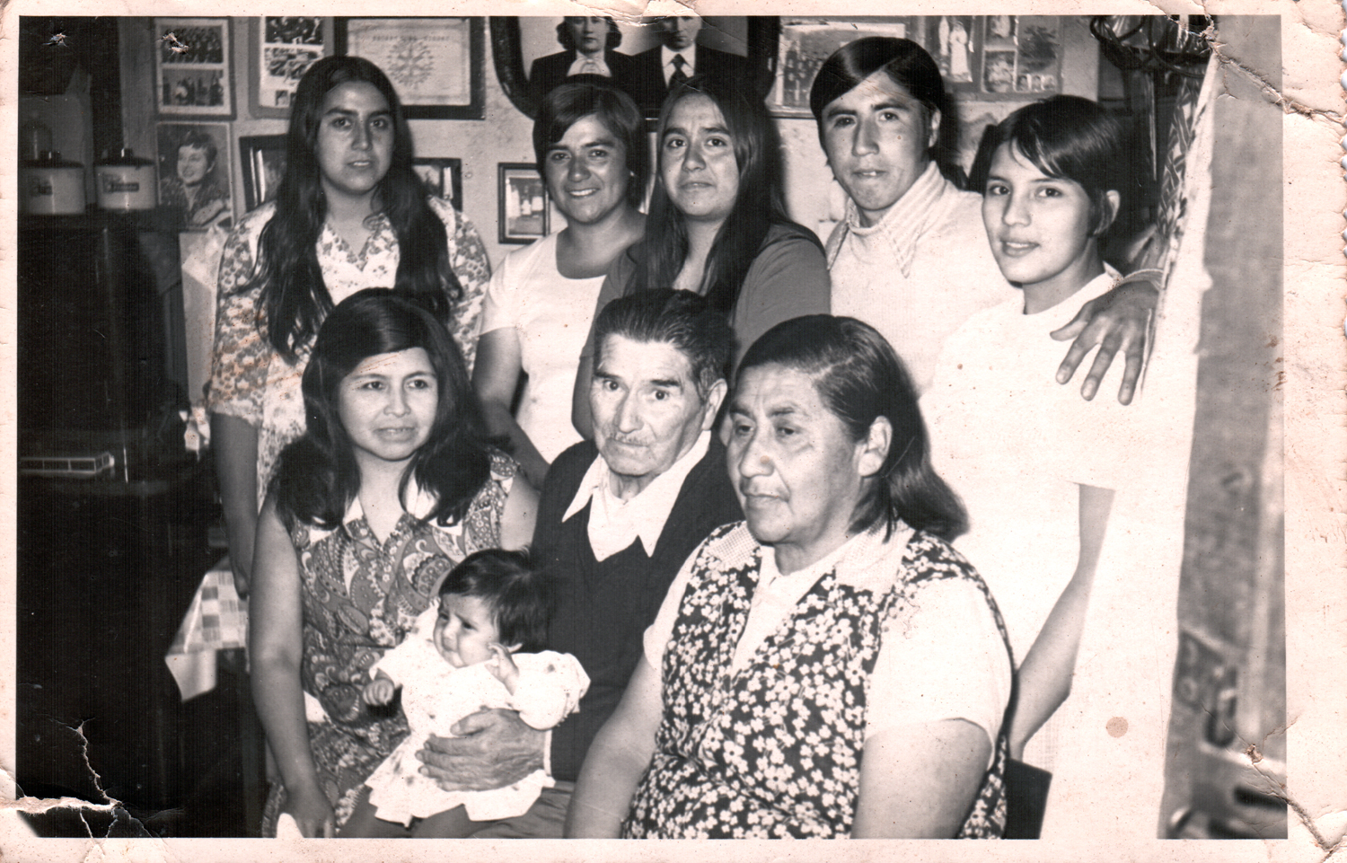 Familia Valdés Zumelzu. Aparecen de pie: Brunilda Valdés Zumelzu, Flor Valdés Zumelzu, Carmen Valdés Zumelzu, Ildefonso Valdés Zumelzu y Teresa Moraga. Sentados: Luisa Obando, Francisco Valdés Lara, Rosalía Zumelzu Barrientos y la bebé Julie Valdés Moraga.