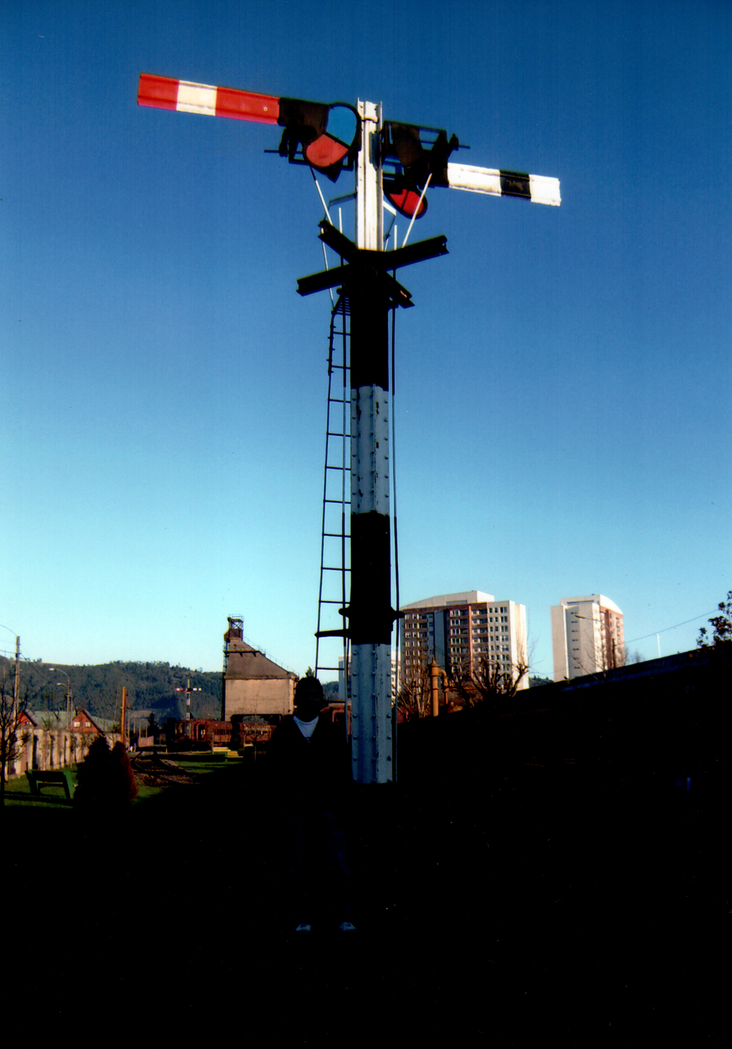Jonathan Weinberger posando junto a la torre de señales que se utilizaba para indicar el paso del tren, la cual era operada por un funcionario de la estación.
