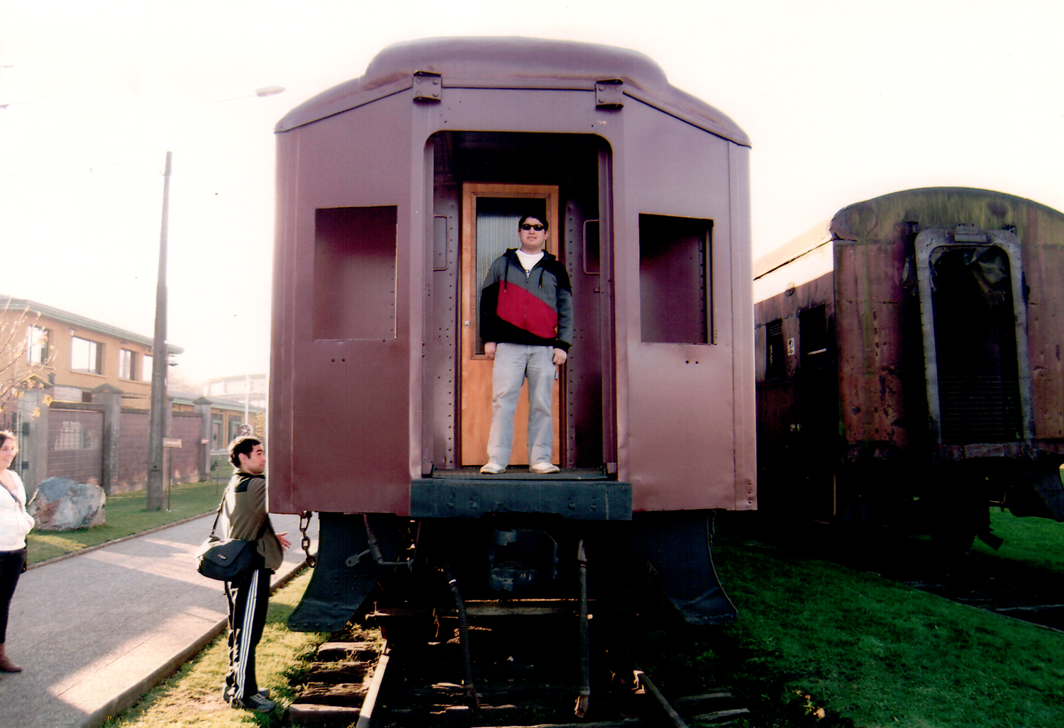 Jonathan Weinberger posando en la parte posterior de un vagón de ferrocarril, ubicado en el Museo Ferroviario de Temuco.