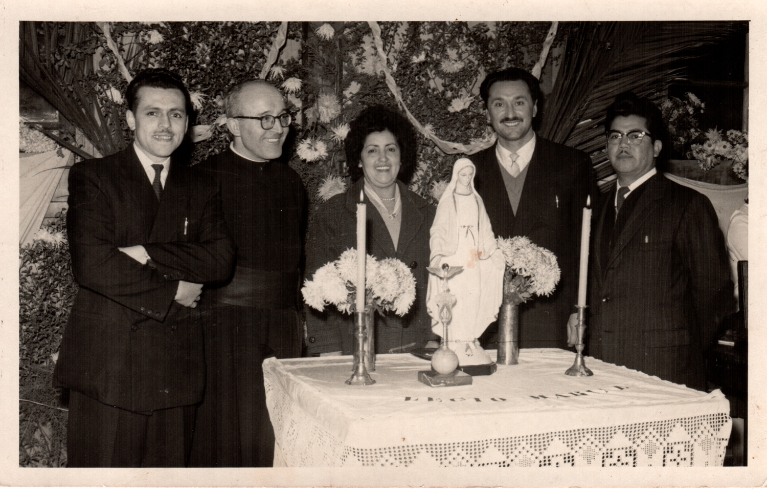 Recuerdo de la Curia, Legión de María. Aparecen el padre Manuel, el padre José, Rosa Ida Bustamante, madre de la donante, junto a Teresa y Erica.