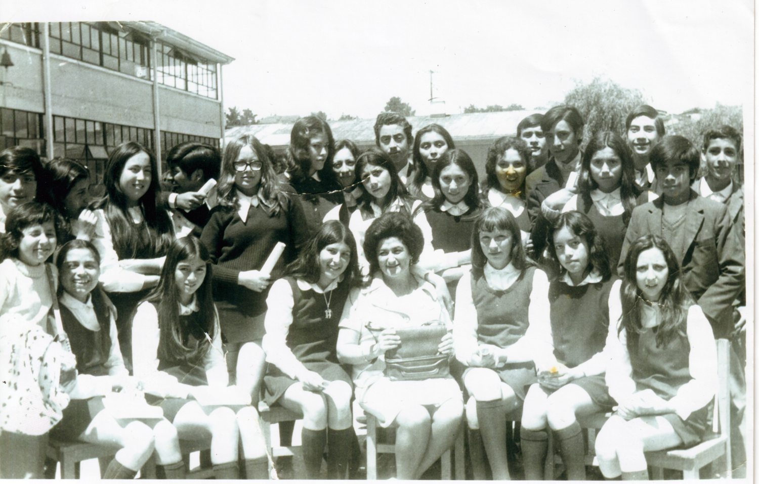 Generación del 74 Escuela EspañaAlumnos de 8° básico de la Escuela España al finalizar el año escolar. En la imagen aparecen junto a su profesora las alumnas Jeannette Muñoz, Violeta Cerón, Frella Muñoz, Ximena Hurtado y Eliana Oyarzo.