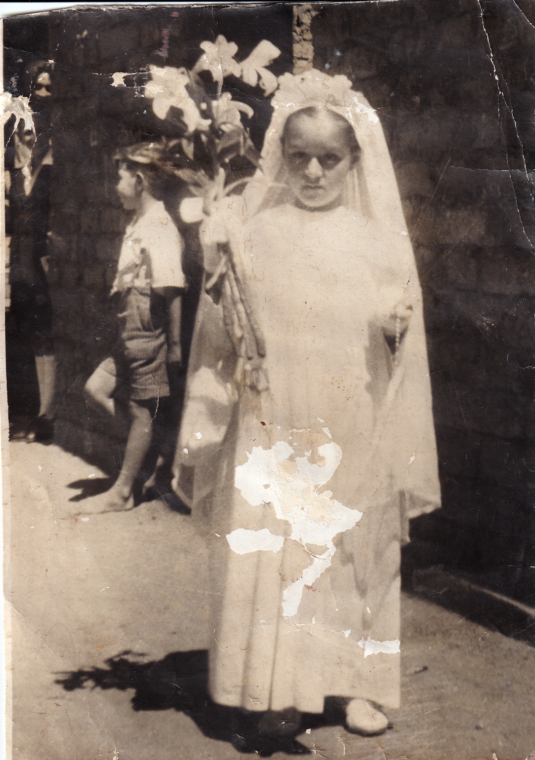 Recuerdo primera comunión Primera comunión de Leonor Poblete. Fotografía tomada en casa de su madrina, Violeta Osorio. Leonor comenta: “Quería mucho a mi madrina porque era una buena persona conmigo. Mi primera comunión la realicé en la Iglesia del Pilar, hoy conocida como Murialdo. Recuerdo que la hice junto a Juan, el hijo de mi madrina, y nos prepararon un desayuno con chocolate y galletas.”