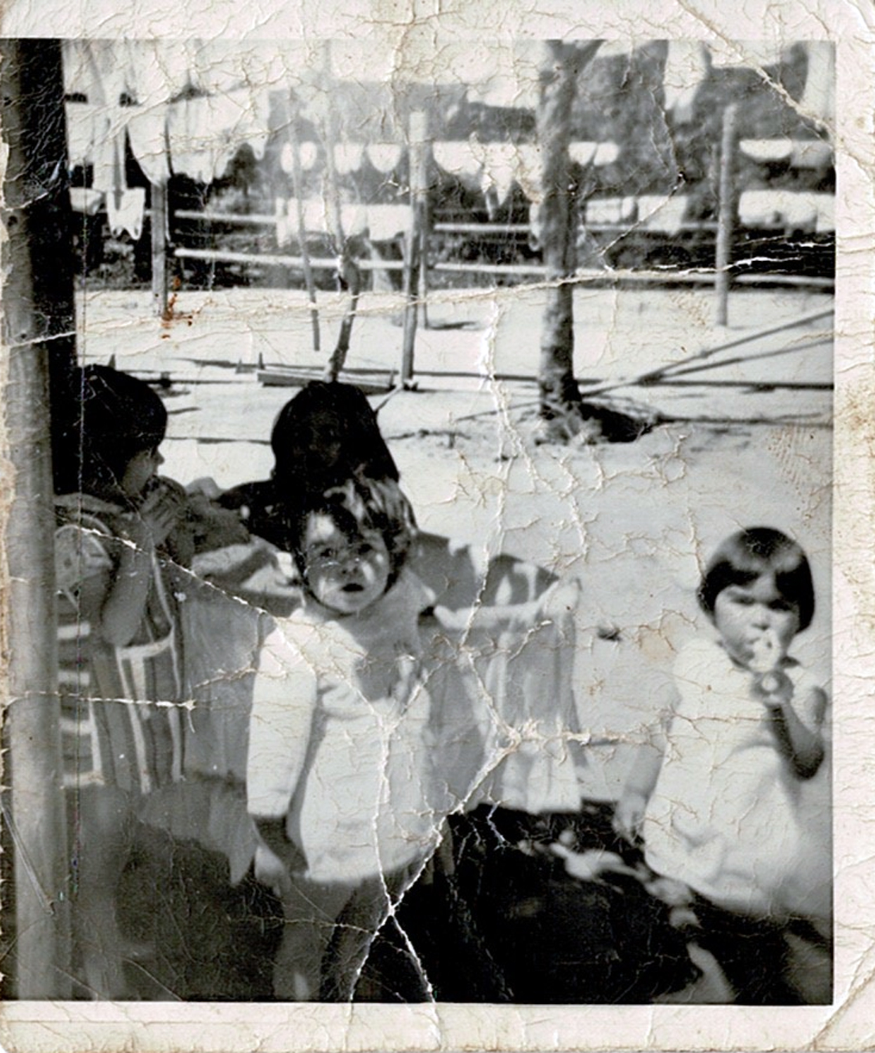 Hermanos Oyarce en el Tranque La LuzEdith Oyarce acompañada de sus hermanos: Patricia, Mariana, Viviana y el pequeño Mario, quien se encuentra en la cuna. El donante comenta: “Mi madre recuerda que, como se criaron juntos y no había tanta diferencia de edad, se divertían, se acompañaban y vivían muchas aventuras. Era común salir a buscar los huevos de las gallinas al cerro, atrapar peces a orillas del tranque, comer frutas de los árboles, etc.”