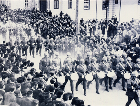 Banda instrumental “El Copihue” ingresando a plaza de Puerto Octay por calle Esperanza, junto a las delegaciones que participan del acto de fiestas patrias. Al frente de la banda, su director Ramón Alvarado Ravena. Al fondo, estudiantes pertenecientes a la Escuela Municipal N° F-462, actual Escuela Alberto Hurtado de Puerto Octay. Se puede ver que la calle principal aún no contaba con asfalto.
