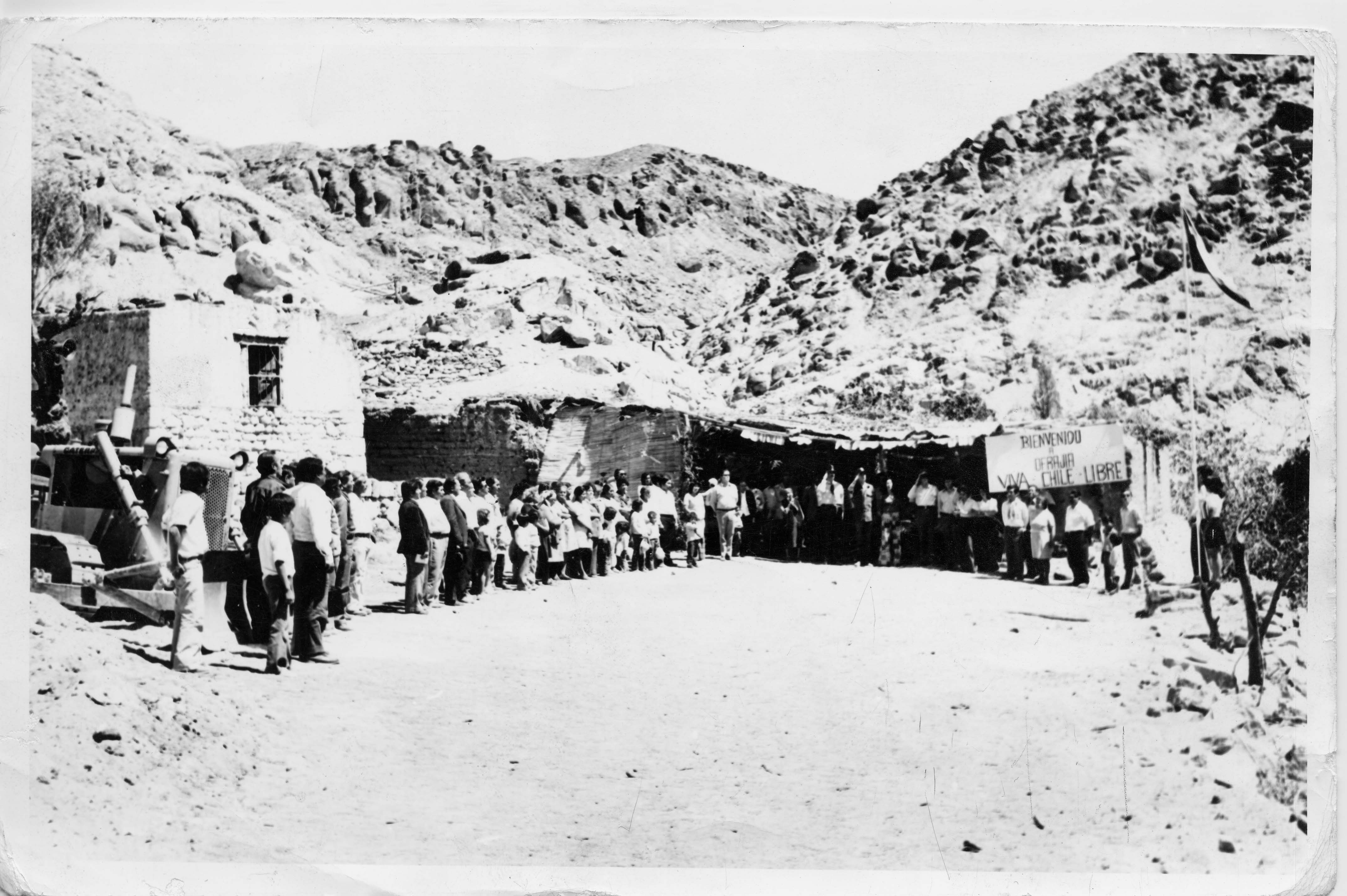 Ceremonia que da termino a la construcción del camino entre las localidades de Codpa y Ofragia. Este camino fue construido por la Junta de Adelanto de Arica. Aparecen habitantes de los pueblos de Amazara, Cerro Blanco, Ofragia y Codpa. Preside la ceremonia Julio Acevedo.
