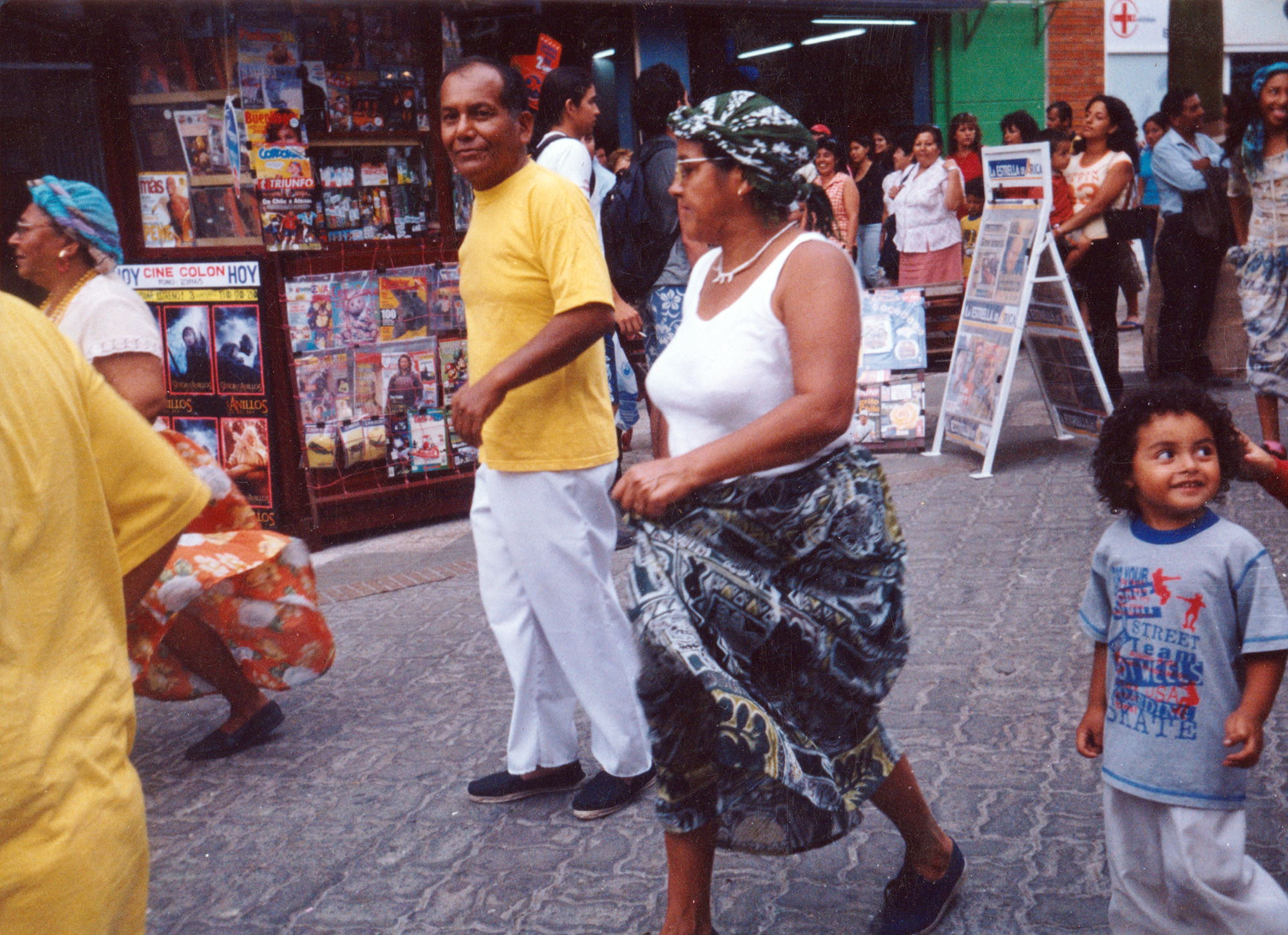 La comparsa Oro Negro terminando su presentación de pasacalle por el centro de Arica. Sentados, junto a los tambores, se identifica a: Juan Fuentes Lara, Diego Breems, Roberto Cereceda, Francisco Piñones. De pie de izquierda a derecha: Verónica Morales, Zulema Corvacho, Cecilia Astudillo, Sandra Castilla, Carla Villalobos Gallardo, Cindi Guillén, Claudio Villalobos Gallardo (niño). En la fila de atrás: Begonia Vega, Vannesa Vargas, Gustavo del Canto, Emilio Fariña, Marcelo Méndez, Yoni Olis, Nelson Corvacho y Marta Salgado.