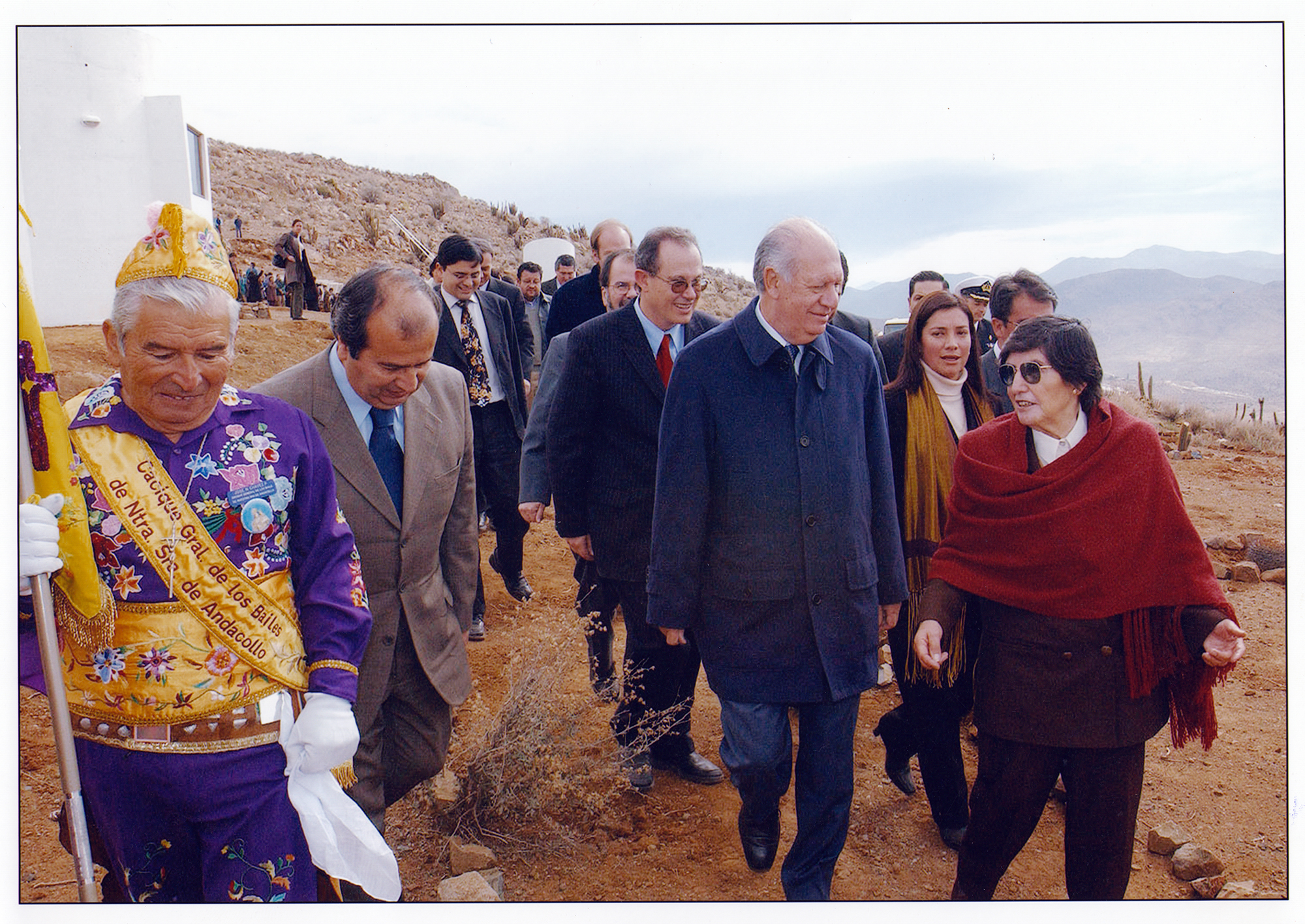 Recorrido al observatorio durante la ceremonia de inauguración. En la fotografía aparecen: José Chávez Pasten, cacique general de los Bailes Religiosos del Santuario de Andacollo; y Ricardo Lagos, presidente de la República.