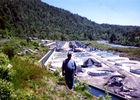 Sergio González posa junto a las piscinas de crianza de alevines en la piscícola de la localidad de Iculpe a orillas del río del mismo nombre.