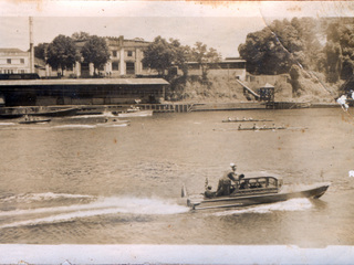 Balseo en el calle - calleBote en el río Calle Calle. A la derecha con vestido blanco está Selene Morales Bustos. Al fondo se aprecia la ribera de Valdivia.