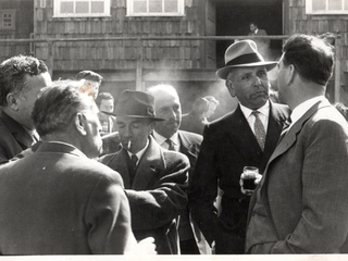 Recepción del candidato presidencial Julio Duran por los integrantes militantes del partido radical en la ciudad de Calbuco. Aparecen: Felipe Kort, Pedro Salem, Santo Mayorga, Rolando Trautmann, Sergio Cárdenas, Tito González y Julio Duran. La foto fue tomada en el antiguo salón parroquial.