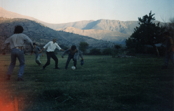 Familia Silva Peralta juegan un amistoso de fútbol después del almuerzo familiar. Aparece el padre Ricardo Silva Vera junto a sus hijos Flavio Silva Paz, Eliseo Avelino Silva Peralta, Ricardo Silva Peralta.