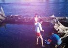 Víctor Jara, Manuel Oñate y Yolanda Rivas, en paseo familiar habitual. En la imagen se encuentran lavando la loza que habían utilizado. El donante recuerda “mi tío Víctor venia de Santiago y era visita obligada el rio”.