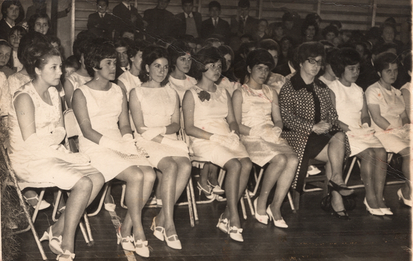 Licenciatura 6° B Escuela NormalLuz Almonacid, María Eugenia Rojas, Yolanda Epuyanca, Sofia Uribe, Eglantina Barrientos, Olga Pérez, Sonia Aros, Rina Ritter, Oclide Yobánolo y Mireya Latorre en el gimnasio de la Escuela Normal, donde se desarrolló la licenciatura de nuevos profesores y profesoras normalistas. La donante comenta “Aparece en la foto el profesor Oñate, quien realizó un discurso en esta jornada”.