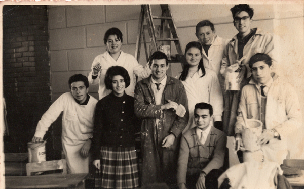 Francisco Contreras, María Eugenia Rojas, Fernando Benavides, Guillermo Nova, Juan Andrade, Gloria Yobánolo, Sonia Aros, Guillermo Buttkovich, y Moisés Molina en actividad de aniversario. La donante recuerda “una de las actividades de aniversario era pintar la sala de clases, donde llevaban sus overoles y delantales y se reunía dinero para comprar pintura y brochas”.