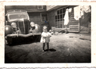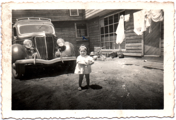 Silvia Herrera a la edad de 2 o 3 años en el patio de su casa, en esquina de Matta con Magallanes. La donante comenta: “Se ve la casa desde el pasaje Magallanes; antes teníamos un cerco de madera. Ese auto pertenecía a mi marido, quien era administrador del fundo Los Pinos en Lautaro, de Osvaldo Becker”.