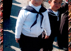 Desfile de Glorias Navales, 21 de mayo. Aparece Antonia, prima de la donante, junto a un compañerito. El desfile se realizó en la calle principal, Avenida Normandie, frente a la plaza, donde está el busto de Arturo Prat.