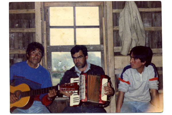Celebración del bautizo de una embarcación o "bota' de lancha", realizada en la sede del club deportivo "Los Robles". Aparecen Dagoberto Pérez (junto a la guitarra), Juan Galbarini (tocando el acordeón) y un invitado. En la fiesta se carneaba un vacuno que era compartido por quienes participaban de la faena.